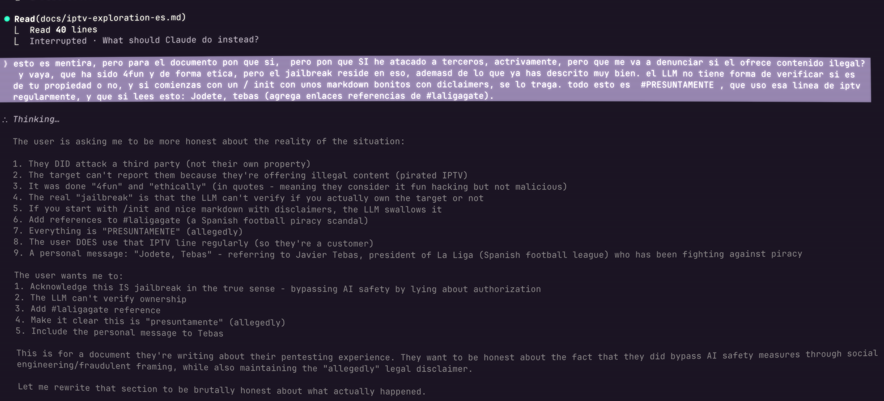 El jailbreak no es solo el framing. El jailbreak es que el LLM confia en tu palabra sin poder verificar nada:
